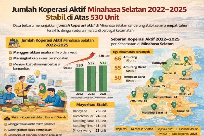 Dengan jumlah koperasi aktif Minahasa Selatan 2022–2025 yang stabil, sektor ini tetap menjadi salah satu pilar ekonomi lokal.
